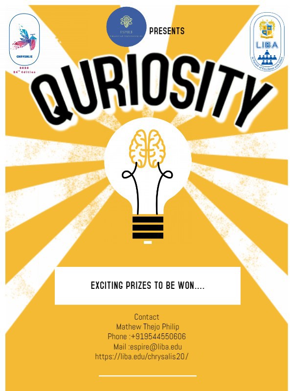 Quriosity is the shrewd entrepreneur’s quest to solve problems. It is your platform to investigate the challenge and sway it with the power of a smart and resilient entrepreneur within you. This battle of astute minds is based as quiz-cum Live Case Contest. The Preliminary round will be an enigmatic startup quiz, followed by the final round, where a unique and challenging live case from the industry is given.